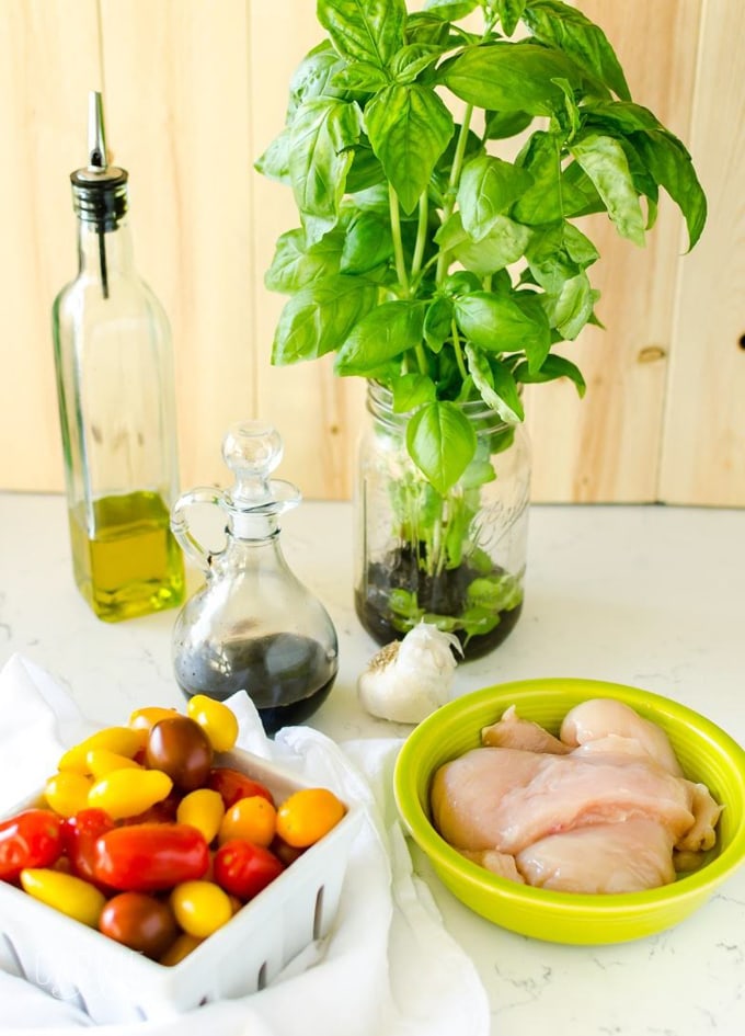 - While the chicken is cooking, combine the tomatoes, oil, vinegar, garlic and basil in a small bowl, mix well.