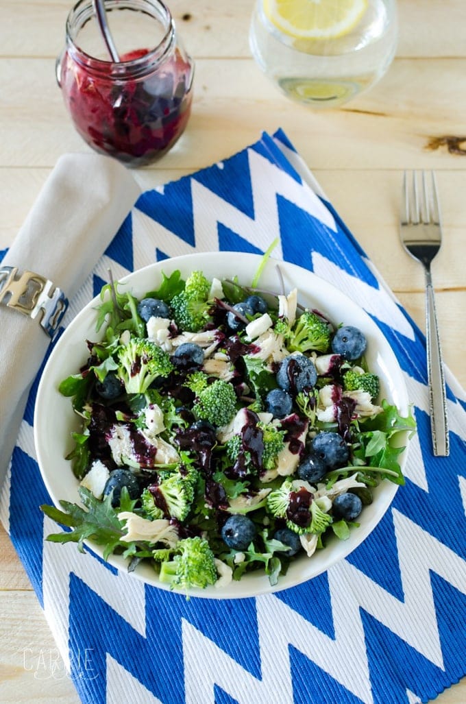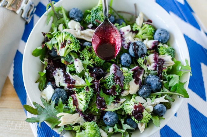 The older I get the more I appreciate a good salad. I mean, really…all those colors and fresh ingredients in one place, smothered in dressing…yum, right?! This 21 Day Fix kale blueberry salad is full of color and flavor and amazing ingredients. And it’s accompanied with a blueberry vinaigrette recipe that I think you’re going to love. This is also a great way to use up leftover chicken. AND! It has cheese. 🙂