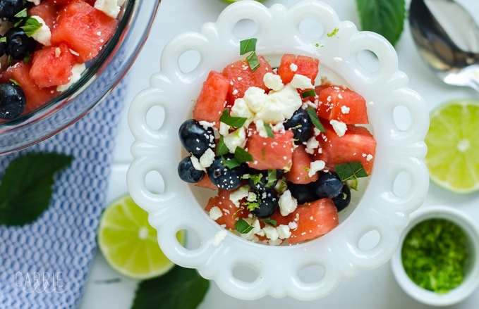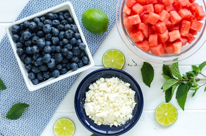 - Combine watermelon, blueberries, feta and mint, stir.