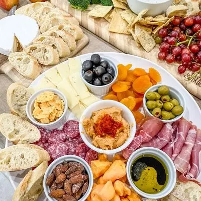 What I love the very most about this pretty collection of meats, cheeses, olives, and snacks is that it was super inexpensive. The total for everything was $80. This will feed 8-10 people, and many of the items you buy will have quite a bit left over. We still have a fridge full of salami, cheese curds, and olives (just to name a few of the things we didn’t finish). Also, our pantry is well-stocked with all the crackers and chips we didn’t use! And we also have apples, grapes, and lots of veggies.