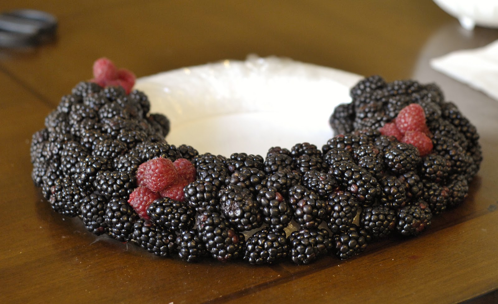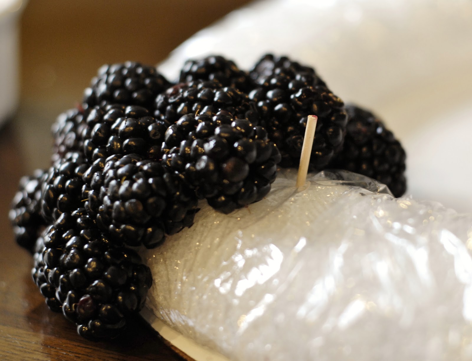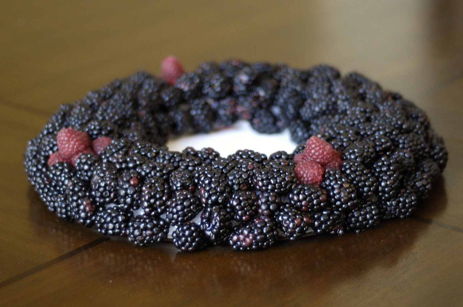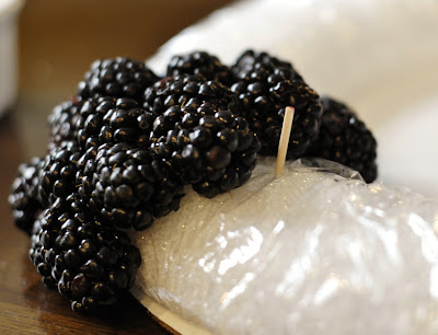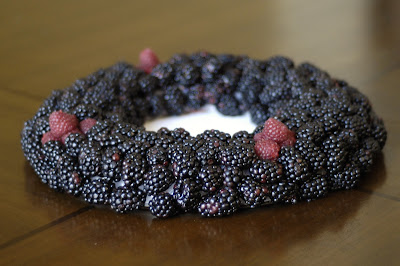 Every so often, add a little bunch of raspberries instead of blackberries.  I used bunches of four.  In the center of the four raspberries, I placed a slightly longer toothpick and set a raspberry on top of it (just sticking the toothpick in the hole, not actually piercing the berry).  Raspberries are very delicate, so be gentle!