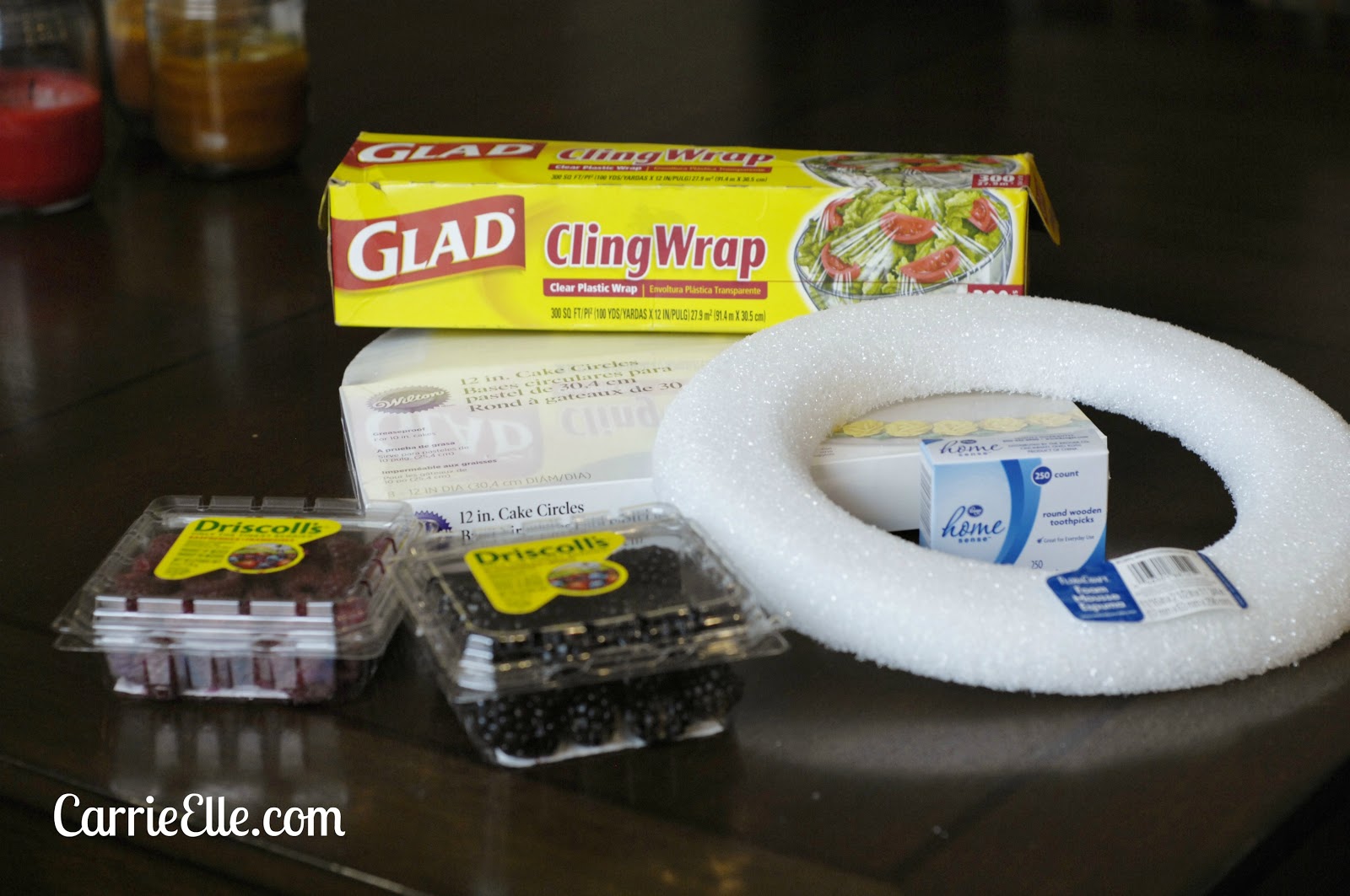 Put the wreath on the cake circle.  Stick a toothpick about halfway into the syrofoam, and gently push the berry onto the toothpick.  Work in lines, placing berries together like you would fit pieces of a puzzle together.  When possible, I pointed the berries in the same direction.