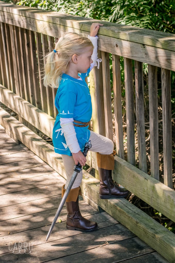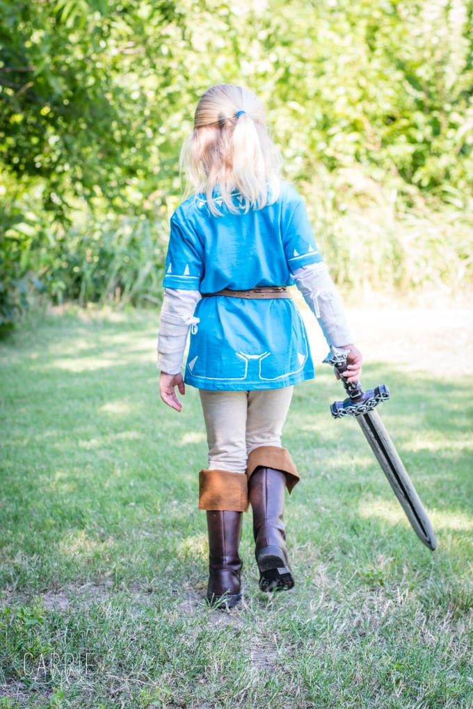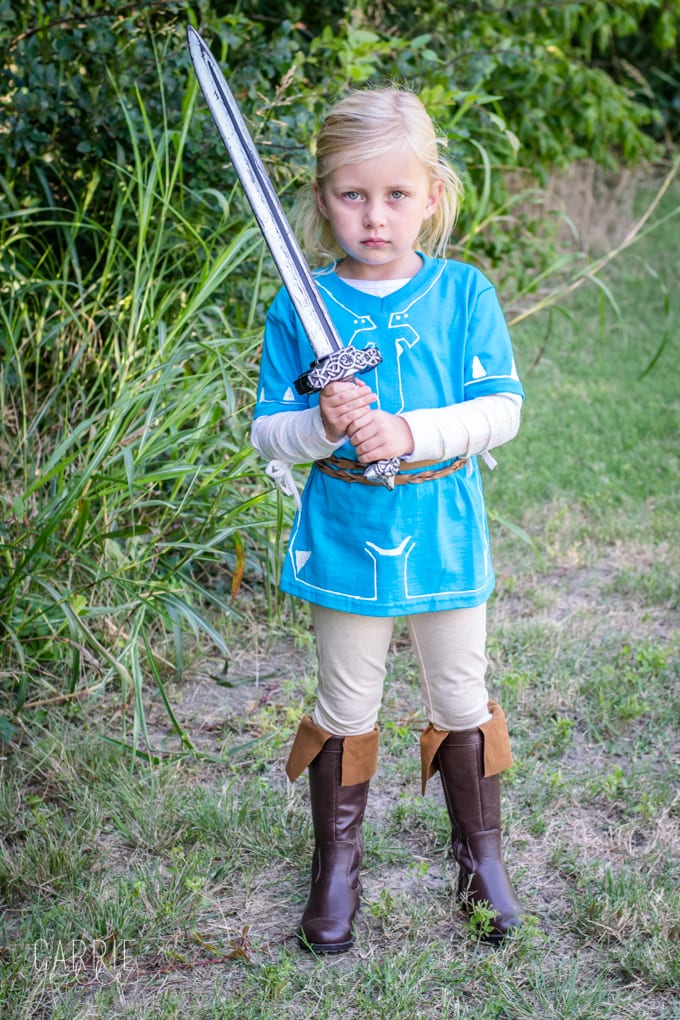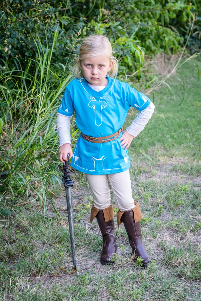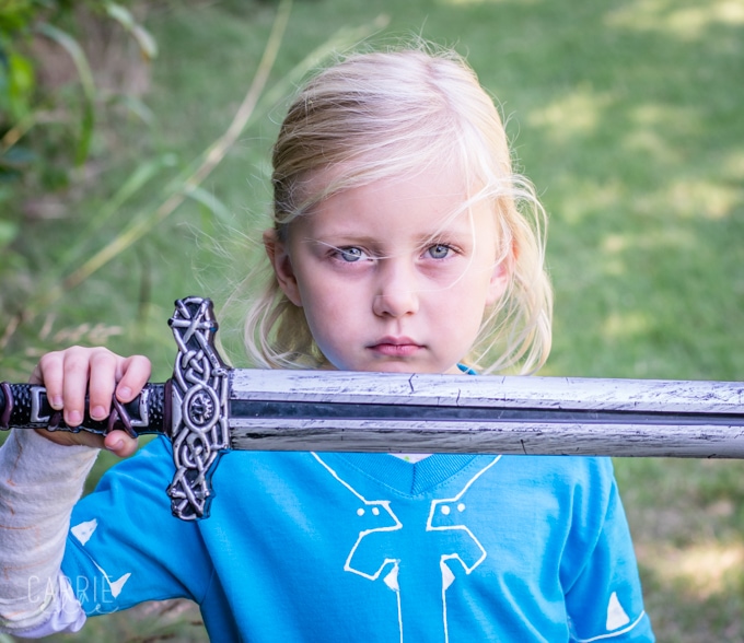 That’s really it! Claire got dressed in her Link costume, we gave her a messy ponytail (authentic to Link *and* Claire), and I wrapped my belt around her waist twice. We used a sword we already had around the house, and ta-da!