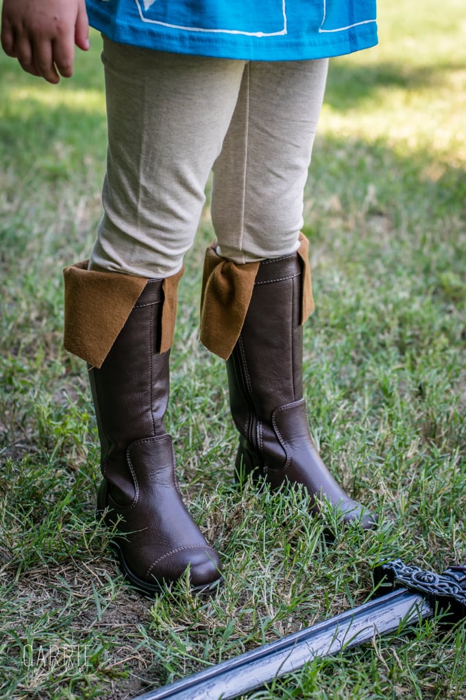 Cut two pieces of brown fabric out for boot cuffs. To do this, just measure around the top of the boot and decide how wide you want the fold. Then cut out your pieces and simply fold over the boots (I left the front open, like Link’s boots!).
