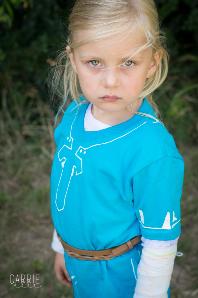 Today my kids are the Nintendo players/experts in the house. When they’re not playing Zelda on the Switch, they’re playing Zelda in our house. And in our car, and outside, and everywhere we go. It’s kind of taken over our world. I decided to roll with it and make a DIY Link costume for Claire – it was cheap and easy, it didn’t take long to make, and it’s SUPER cute (also, comfy – which is helpful when she’ll be wearing it a lot for play!). Link wears many outfits in Breath of the Wild – this particular shirt is called the Champions Tunic.