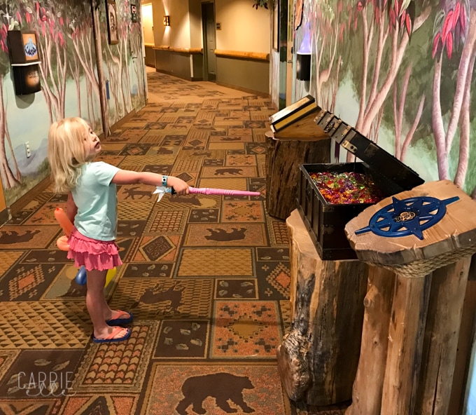 What is MagiQuest? My eight-year-old was really into MagiQuest. MagiQuest is a fantasy game that takes kids through the hotel looking for clues to unlock treasures and defeat levels. We played for a couple of hours and the kids made it through a level-and-a-half (I’m not sure how many levels there were, but I think eight or so). Anyone who completes the Quest gets a badge saying they defeated the game.