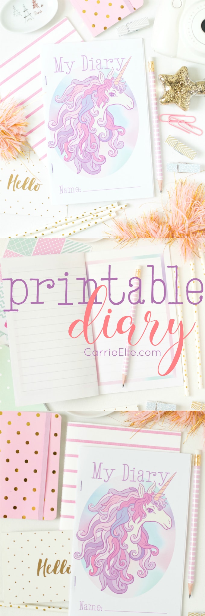A printable diary template is perfect for anyone who loves unicorns. Print out the lined pages and pretty blank pages & start writing!