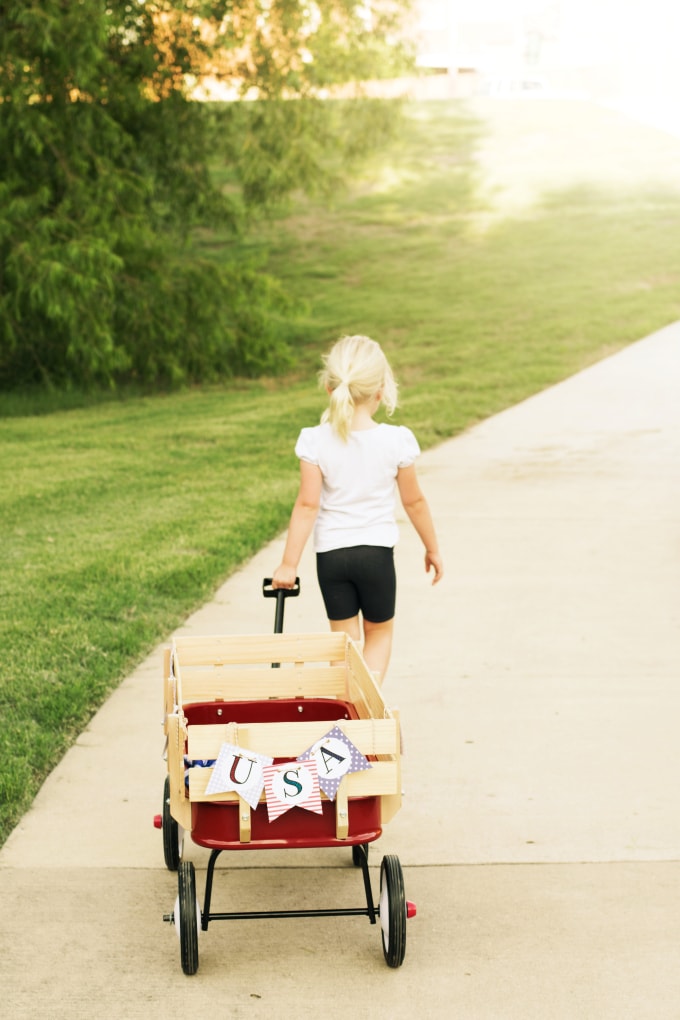 The other day, we decorated our Radio Flyer wagon with a printable USA banner. I made it for the 4th of July. Every year on the 4th, we load up and head to a local park, our wagon stuffed with cold drinks, snacks, blankets and chairs. There aren’t any presents or fancy dinners, but this holiday has become one of our family’s favorites.