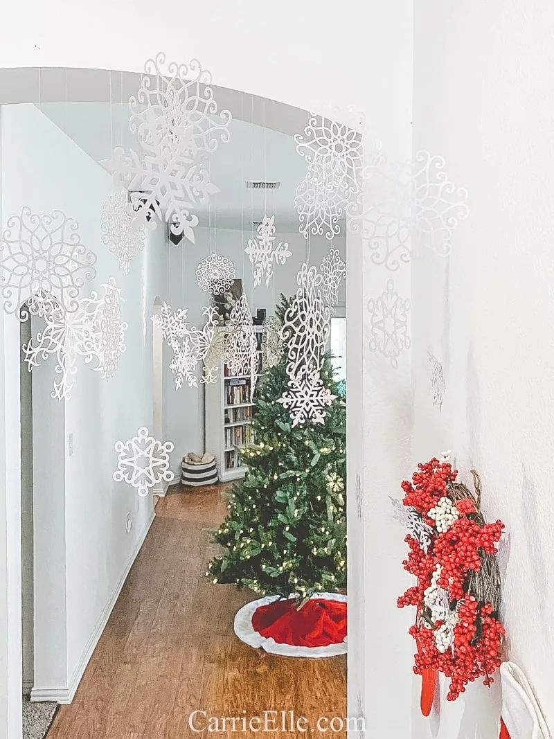 I have been having so much fun with my Cricut these last few months (did you see the pumpkin wall I made back in October?). For months now, I’ve been planning out my Christmas crafts. The first one to come to life is this paper snowflake winter wonderland. It’s one of the first things you see when you walk into my house and it’s added a magical touch to an otherwise boring space.