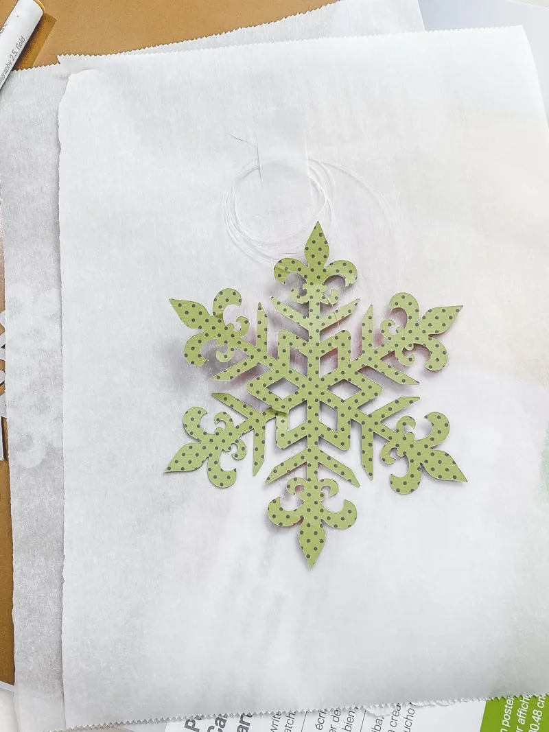 Like I mentioned earlier, these things are SO tangly. They’re also pretty, and took a lot of cutting, and you’re definitely going to want to use them again! You really want to keep them separated. Before you take them down, cut out a piece of parchment for each paper snowflake (see the picture below). Grab a piece of parchment. Wrap up the fishing line in a loop and tape it to the parchment. Lay the next piece of parchment down on top of it for the next snowflake. This will keep the wire from getting tangled and also keep the snowflakes from getting tangled!
