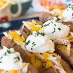 Carefully remove potatoes from pot. Mine sat out for a while to cool and dry off, and then I cut them open and filled each with 1/4 each of chicken. Add 1/8 cup cheese to each potato, then top with 1/4 cup Greek yogurt and chives.